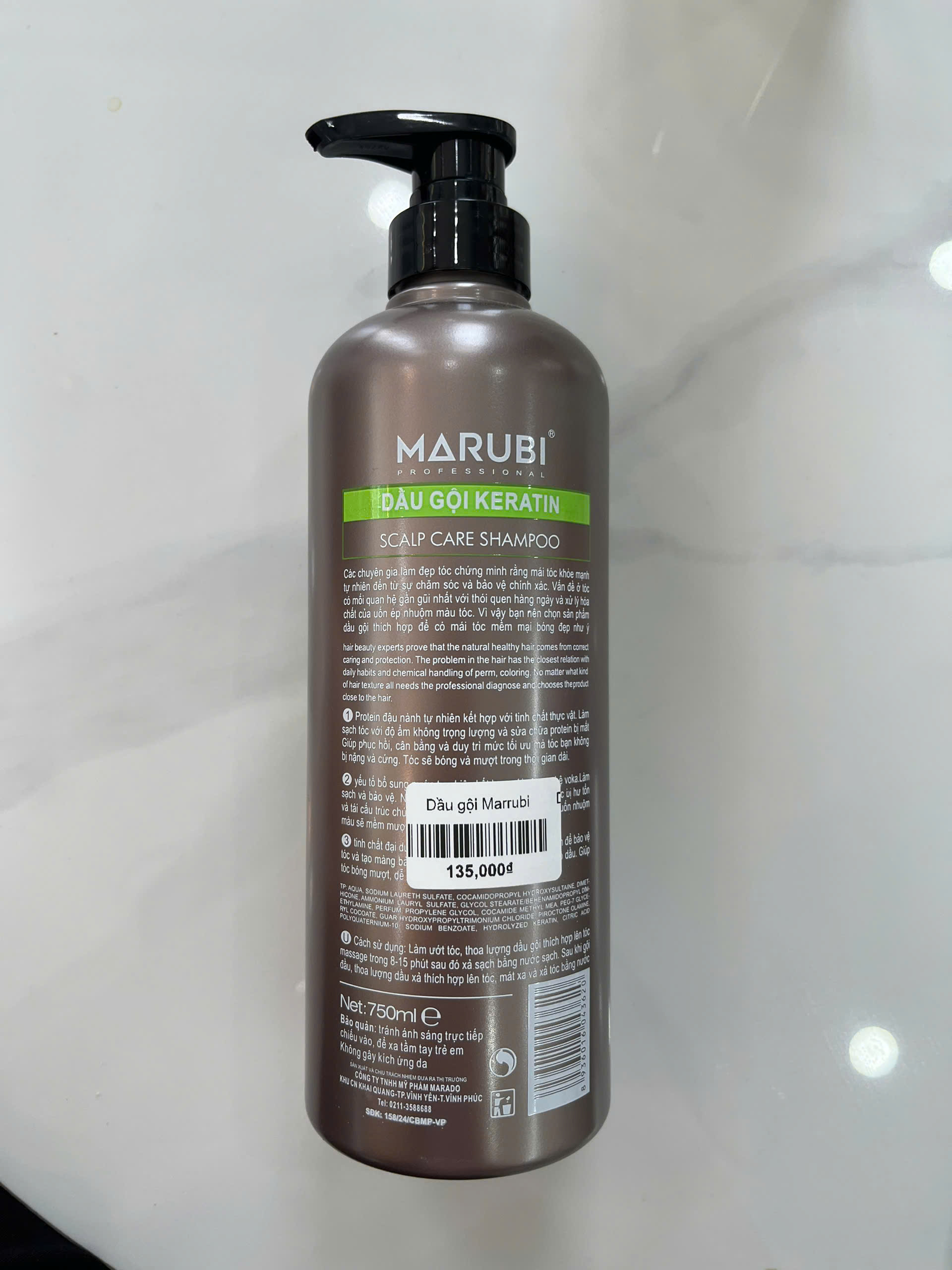 (Thông tin tham khảo dựa trên dòng sản phẩm Marubi Keratin): Aqua (Water), Sodium Laureth Sulfate, Cocamidopropyl Betaine, Hydrolyzed Keratin (Keratin thủy phân), Zinc Pyrithione (hoạt chất giảm gàu), Glycerin, Fragrance, Citric Acid, và các dưỡng chất bổ trợ khác.