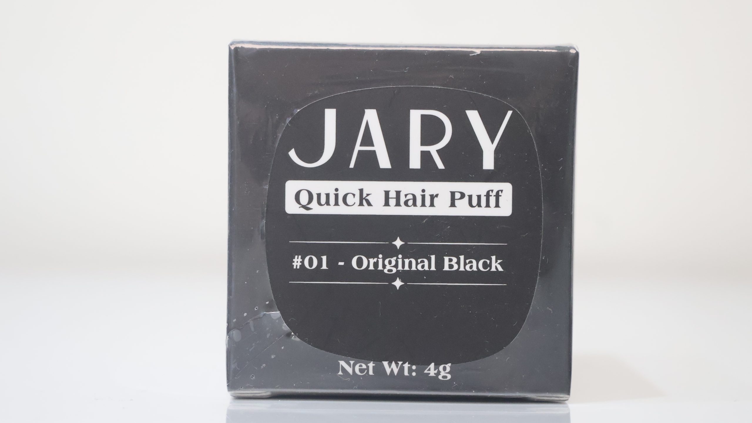 Sản phẩm có bao bì dạng hộp giấy hình vuông màu đen chủ đạo, mang phong cách tối giản và chuyên nghiệp. Mặt trước in tên thương hiệu “JARY” lớn, dòng sản phẩm “Quick Hair Puff” và thông tin màu sắc “#01 – Original Black”. Trọng lượng tịnh được ghi rõ là 4g. Thiết kế bên trong (theo đặc trưng dòng Hair Puff) thường bao gồm một hũ phấn nén đi kèm với miếng bông mút (puff) tích hợp sẵn ở phần nắp hoặc đáy để thuận tiện cho việc dặm phấn.