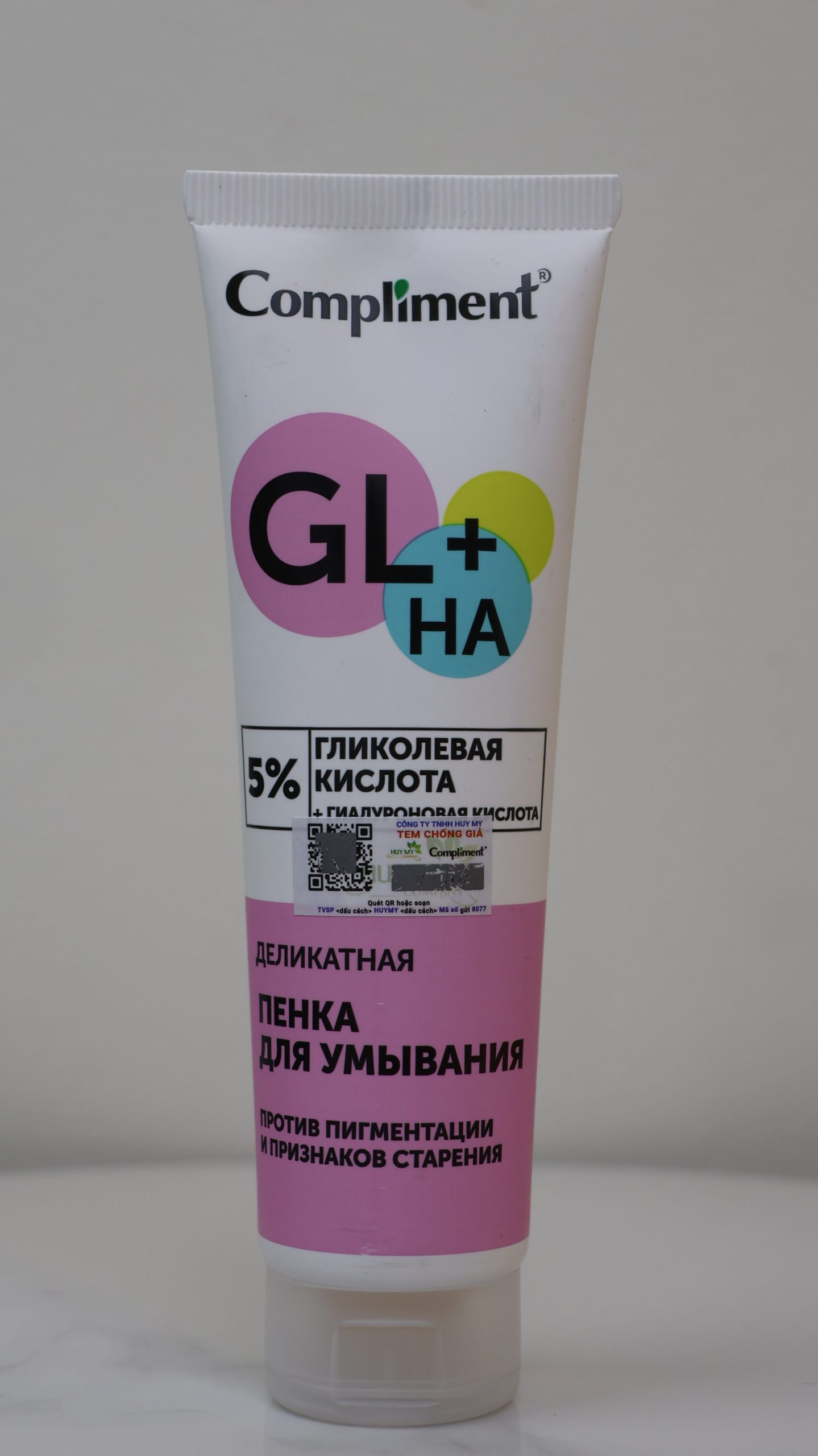 Aqua, Sodium Lauroyl Sarcosinate, Cocamidopropyl Betaine, Glycerin, Glycolic Acid (5%), Hyaluronic Acid (Sodium Hyaluronate), Panthenol, và các chiết xuất hỗ trợ khác. (Thông tin thành phần dựa trên kiến thức chuyên gia về dòng sản phẩm Compliment GL+HA để bạn tham khảo).